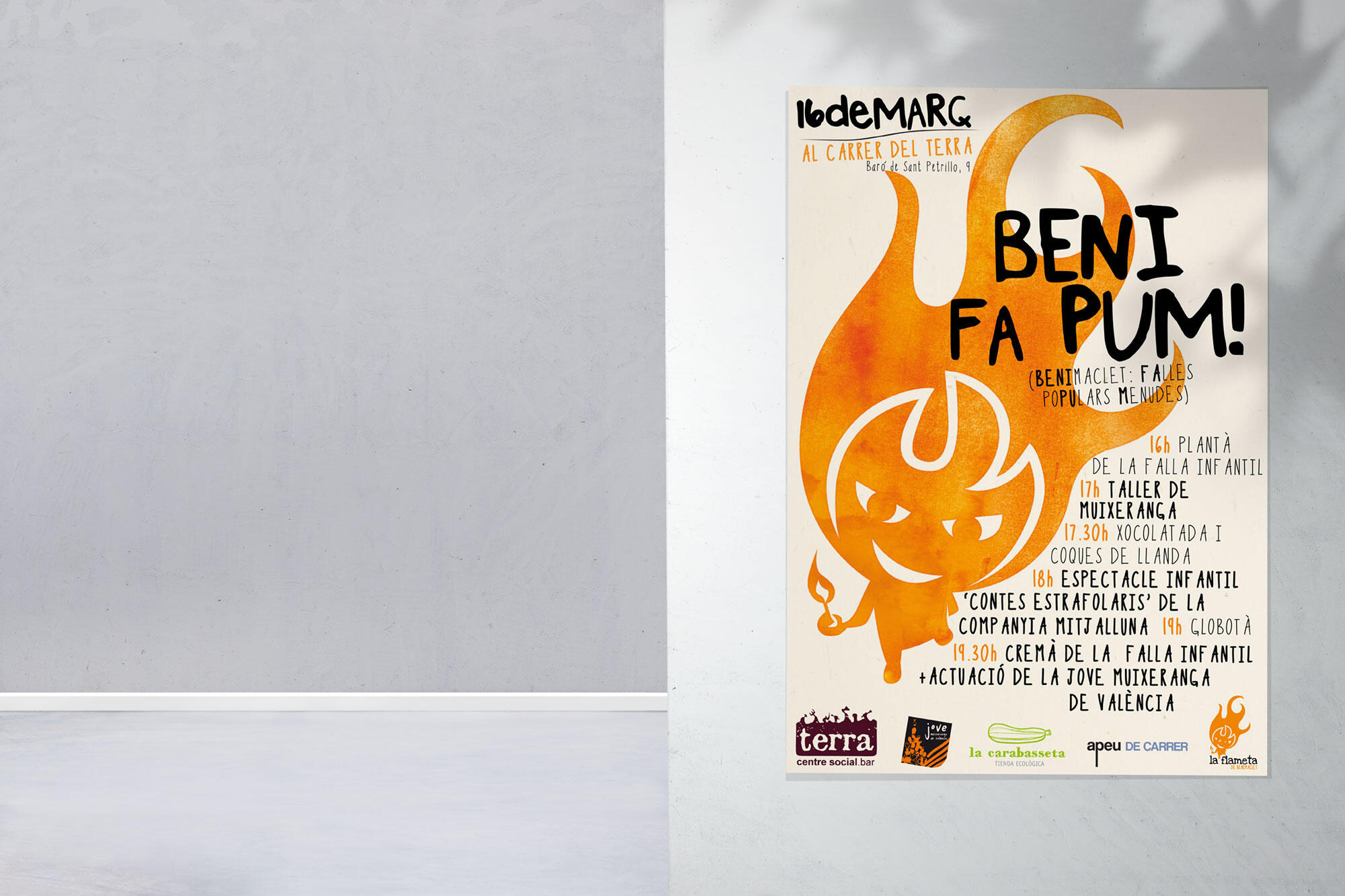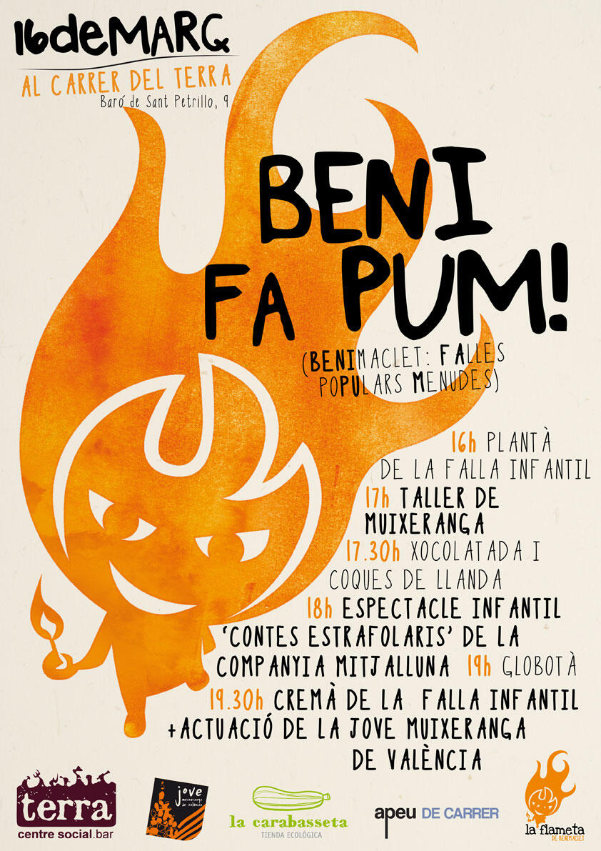 El reciente formato colectivo Flameta (grupo de madres y padres creando nuevos espacios por sus hijos) lanza su primera actividad: El ‘Beni Fa Pum!’ (Benimaclet, Fallas Populars Menudes). Un espacio lleno de actividades infantiles para niñas y niños fuera del entorno fallero habitual. Necesitaban logo y cartel con la programación, además de pañoletas falleras.