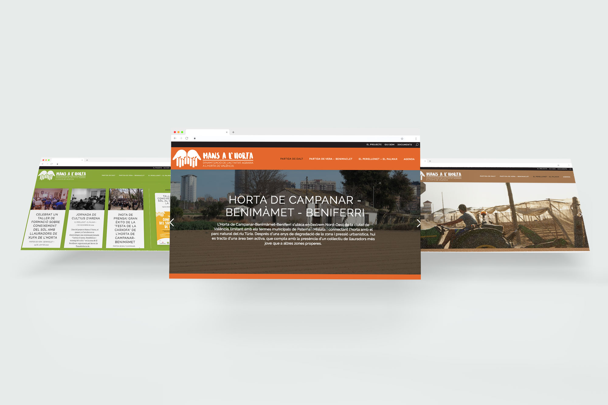 Imagen corporativa, cartelería corporativa y web por el proyecto de dinatmizació de la actividad agraria a la huerta de València. El logo tiene 4 variaciones de color, cada barrio se representa con un color propio tanto en la web como a los carteles promocionales.