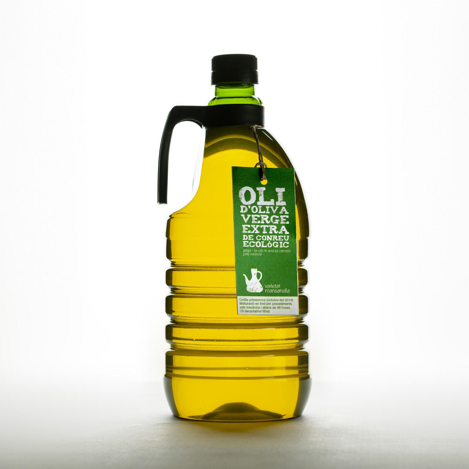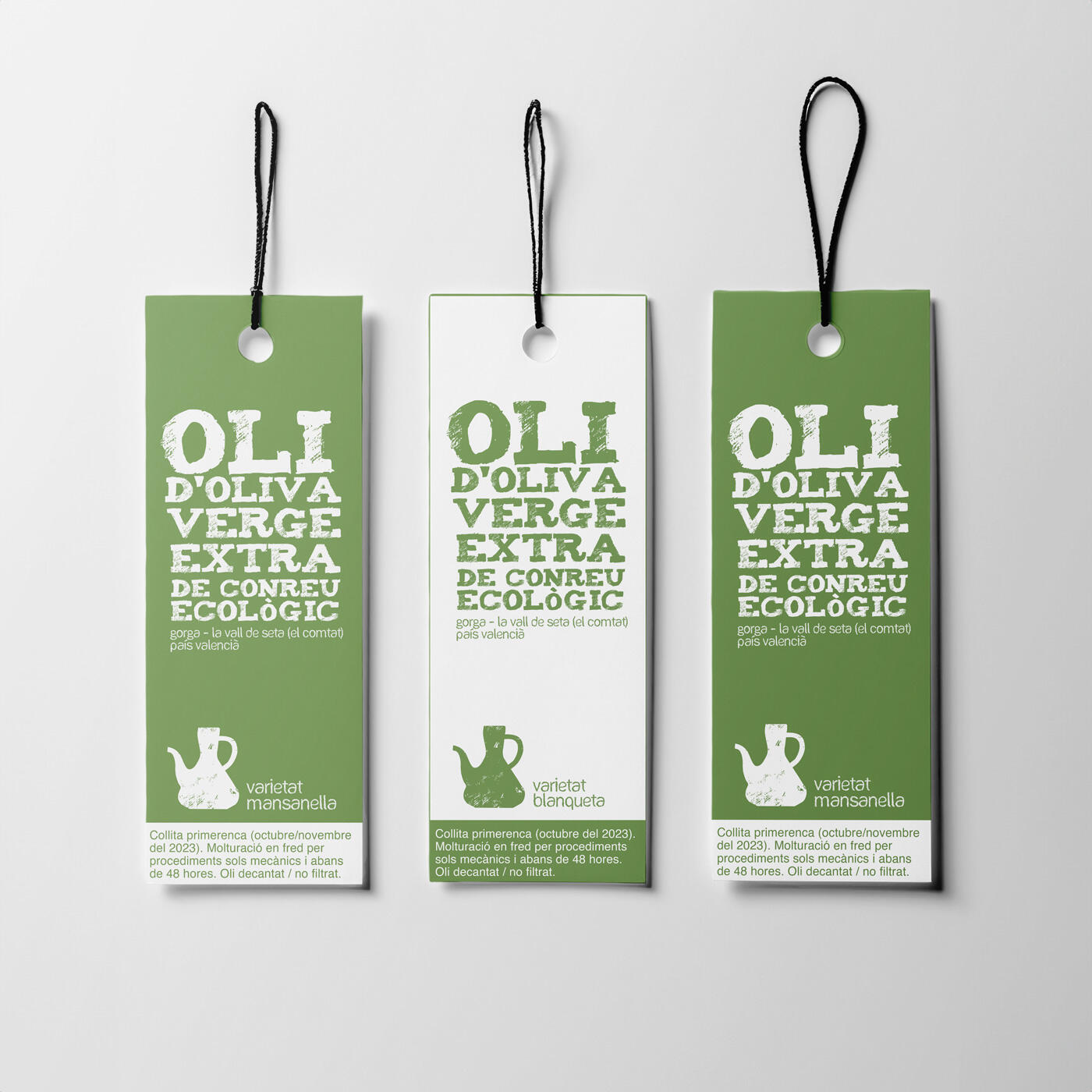 Disseny d’etiquetes per a una marca artesanal d’oli d’oliva verge i ecològic. Dos variants d’oli provinents de diferents tipus d’olives. Es buscava la convinació d’elements tradicionals, artesans i naturals al mateix temps. A més, calia minimitzar costos per tractar-se d’una empresa familiar. Per aquest motiu les etiquetes son iguals per a els dos tipus d’ampolla (de 5 i 2 litres) i s’utilitza la mateixa tinta en ambdues, de manera que es pot aprofitar el mateix fotolit per crear-les. L’etiqueta va penjada amb una corda fina a l’ansa de l’ampolla.