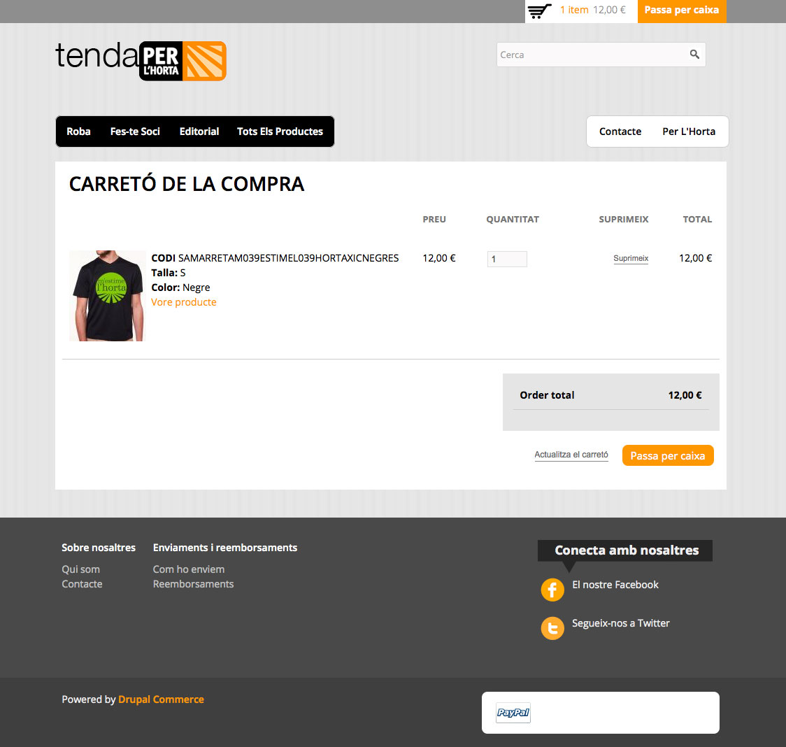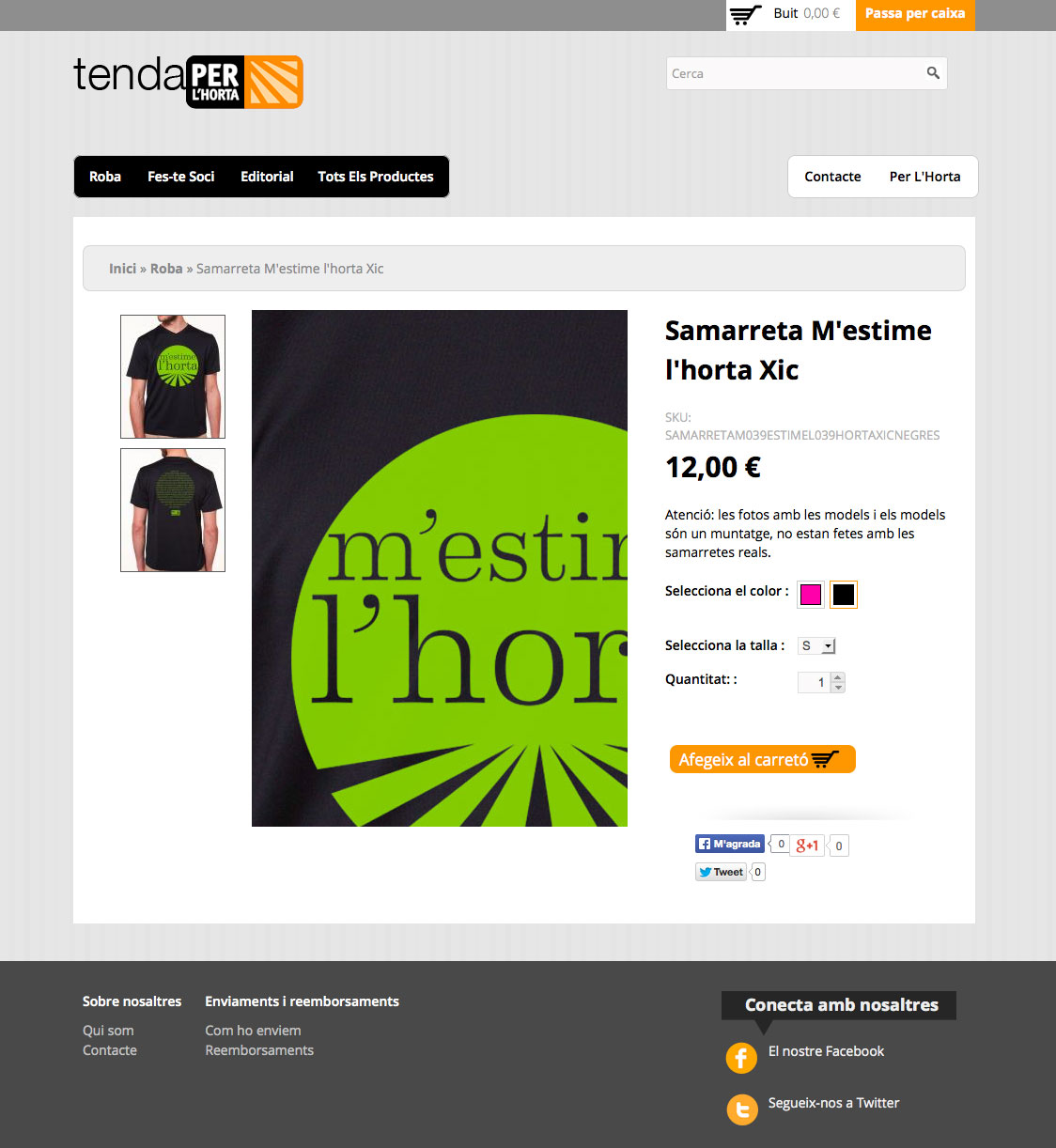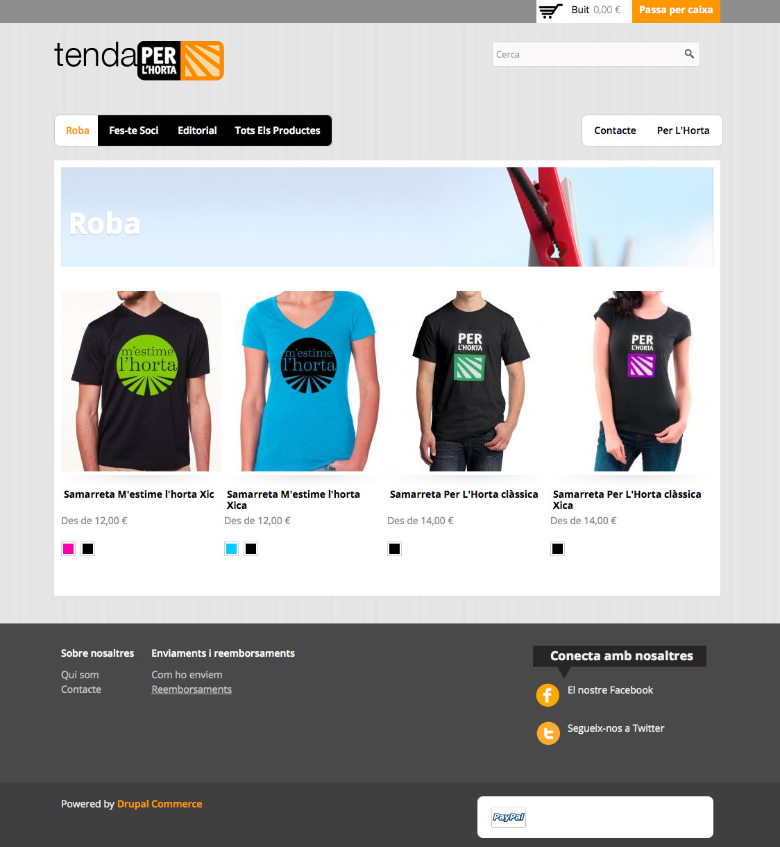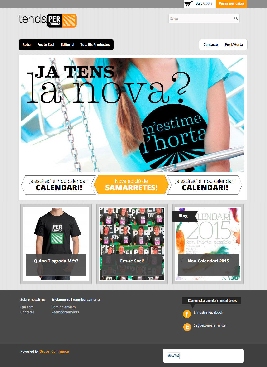 Per L’Horta fa 10 anys que ven samarretes al carrer, sempre amb una paradeta en moments concrets, tanmateix dona un pas més enllà al món virtual i vol exposar el seu material vendre’l a través d’una botigueta senzilla però eficient. Aprofiten també per crear un altra via per subscriure’s a l’associació. El projecte ha estat desenvolupat en e-Commerce sota Drupal 7.
